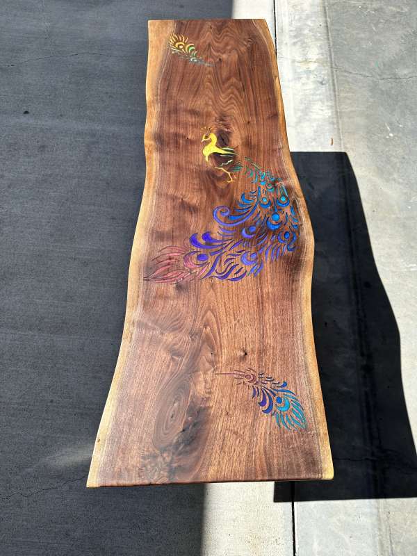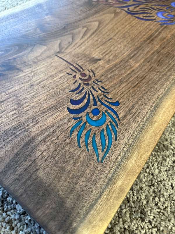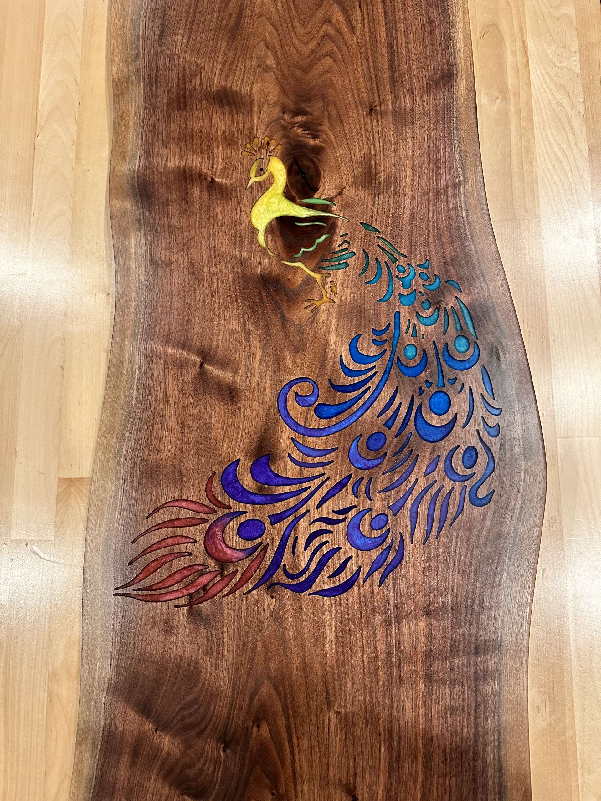 Home / Furniture / Peacock Epoxy Inlay Coffee Table Peacock Epoxy Inlay Coffee Table$450.00 Peacock Epoxy Inlay Coffee Table quantity Buy now Category: Furniture Tags: Epoxy Inlay, Walnut Product ID: 1198 Description Description Beautiful figured walnut with a custom designed peacock epoxy inlay. Table is approx 45″ L x 15″ W. Legs are detachable with screws and metal inserts, so shipping is possible for a slight upcharge depending on location.